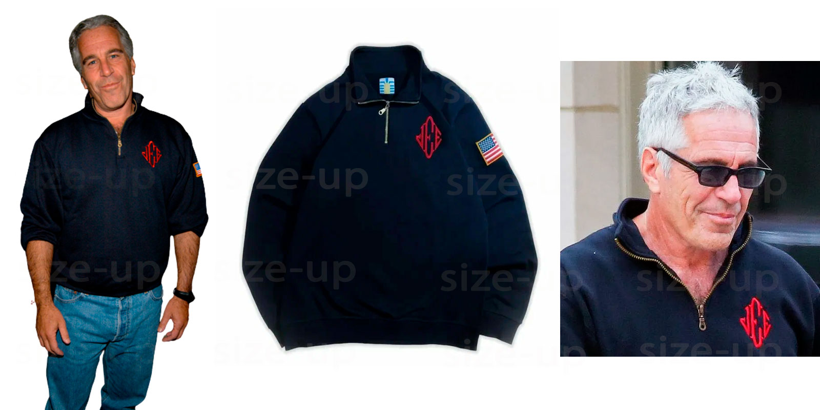 Одним из самых узнаваемых элементов гардероба у Джеффри Эпштейна стал тёмно-синий свитшот на молнии до середины груди. На груди этой модели обычно вышиты инициалы «J.E.E.», а на левом рукаве — маленькая нашивка с американским флагом. Такая комбинация придавала вещи одновременно лаконичность и индивидуальность, делая её настоящим символом его стиля.