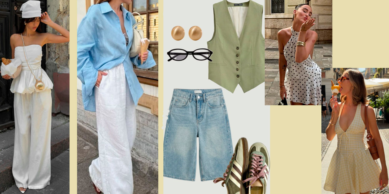 Что касается низа, в тренде остаются широкие брюки, шорты средней длины и юбки миди. Они создают расслабленный силуэт и подходят для разного типа фигуры. Параллельно с этим в гардероб возвращаются жилеты и лёгкие костюмы без рукавов — они выглядят более собранно, но при этом не перегружают образ в жару.